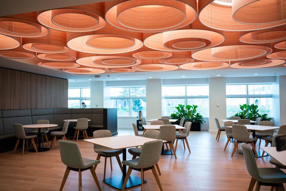 The 10th floor has an enhanced micromarket with vending machines offering snacks and hot food options such as White Castle burgers and egg roles. Tables, chairs and restaurant-style booth seats are also nearby.