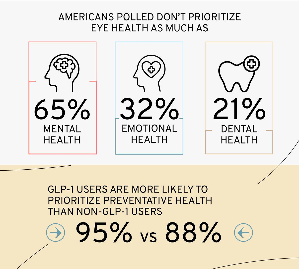 Although GLP-1 users especially agree that preventative health care is important to them (95% vs. 88% of non-GLP-1 users), one in seven haven't had an eye exam in the last year. Still, eye health seems to be a higher priority for GLP-1 users than non-users.