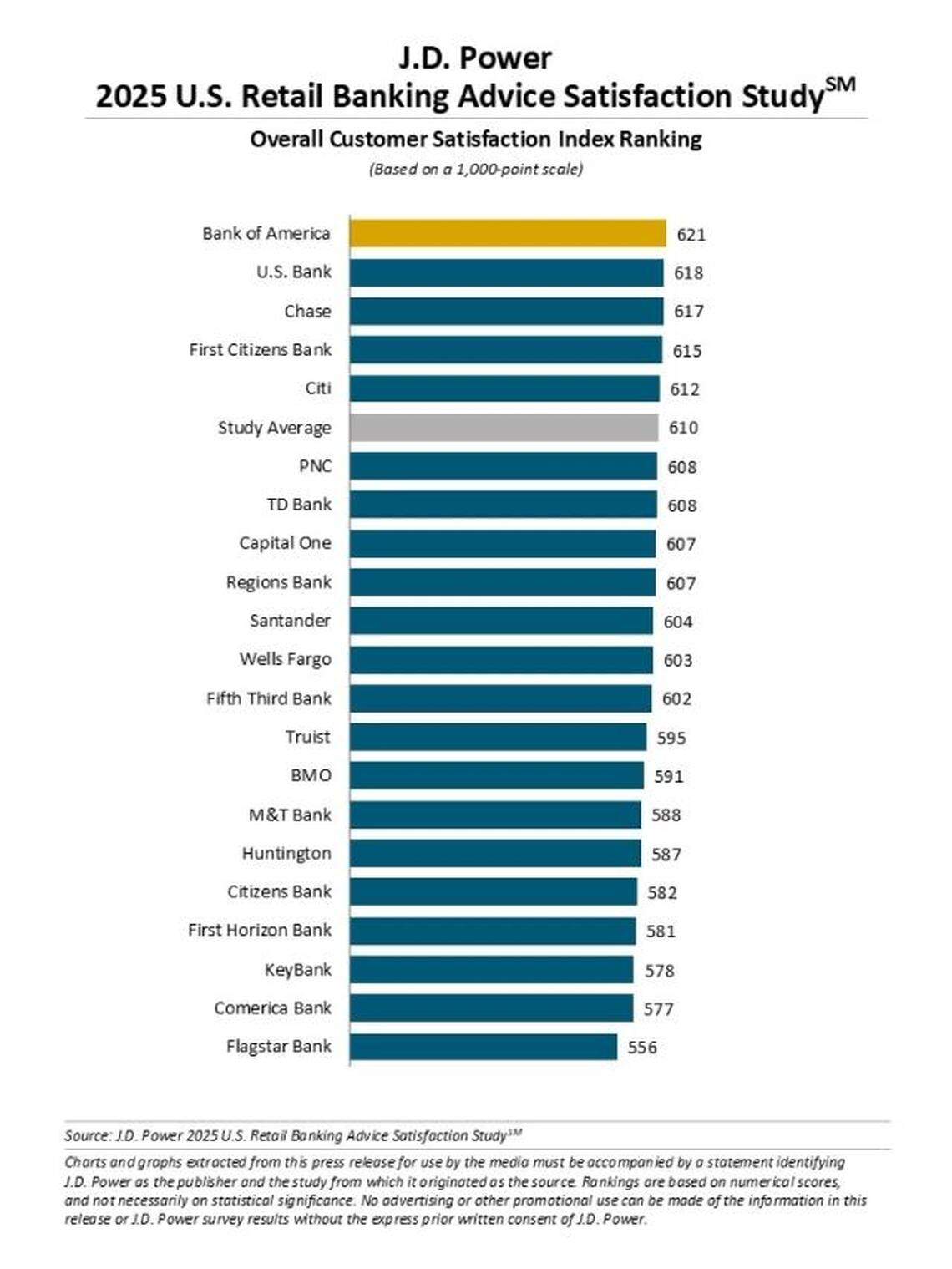 Bank of America scored 621 on a 1,000-point scale. The study included 8,903 retail bank customer responses who received advice or guidance from their primary bank from March 2024 to March 2025.
