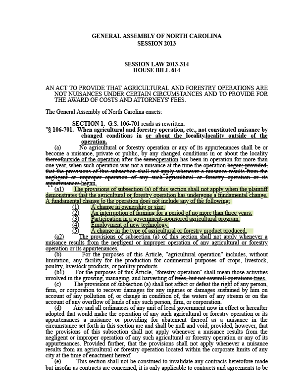 House Bill 614 (April 9, 2013) Nathan Ramsey, R-Buncombe; Michele Presnell, R-Yancey; and Kenneth Waddell, D-Columbus. After neighbors to hog farms in Eastern North Carolina filed lawsuits against large pork companies, this bill named changes that cannot be cited as a basis for nuisance lawsuits. Those include changes to what farms produce, their ownership, their size and the technology they use.