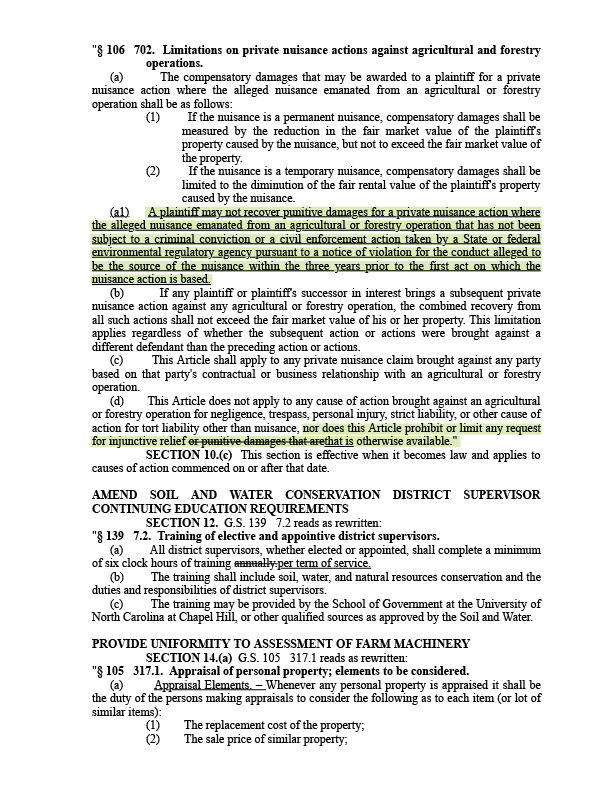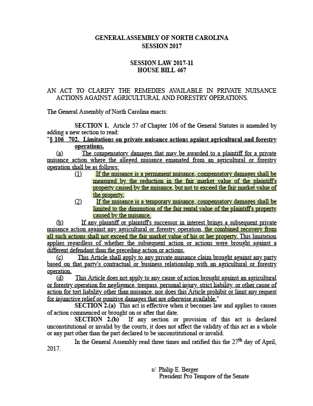 House Bill 467 (March 23, 2017) Jimmy Dixon, R-Duplin; Ted Davis, R-New Hanover; David Lewis, R-Harnett; and John Bell, R-Wayne. Capped compensatory damages awarded in farm nuisance lawsuits to losses in property values.