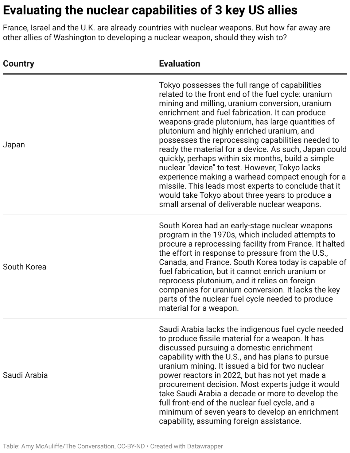 Until just a few years ago, few experts would have predicted that these nations – all allies of Washington – might one day join the nuclear club. Since 2006, that club has consisted of just nine countries : the United States, Russia, the United Kingdom, France, China, India, Pakistan, North Korea and Israel, with its undeclared program.